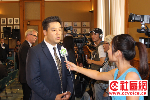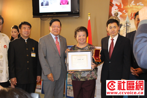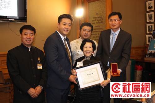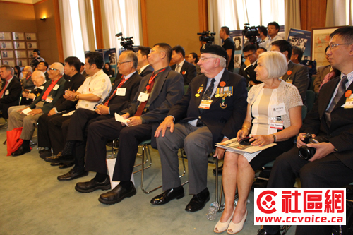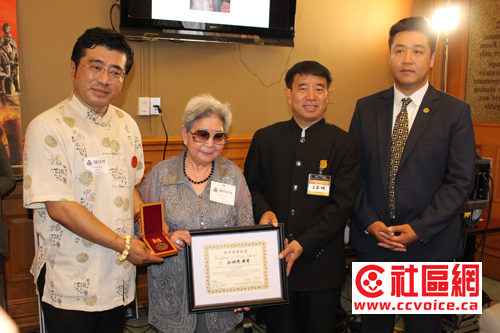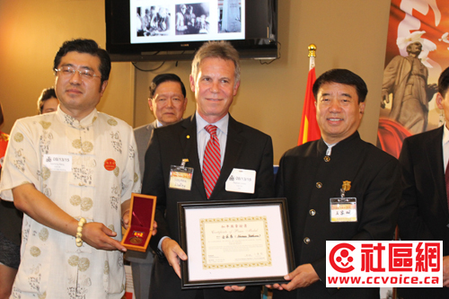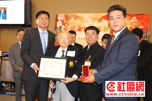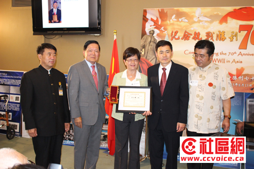 加拿大中华民族反法西斯暨抗战胜利70周年纪念活动联合组委会8月13日(淞沪战争纪念日)在安省政府举办座谈研讨会及文物史料图片摄影巡展,表彰参加过二战、抗战的国、共、亚裔、加拿大裔健在的老战士及其遗孀或后人,并为揭露日本南京大屠杀、篡改教科书、参拜靖国神社、强征慰安妇、非法侵占钓鱼岛等无数事实真相所做出杰出贡献的的海外华人华侨并授予“荣誉功勋”纪念奖章及证书。到场嘉宾有参议员胡子修(Victor Oh)、中国驻多伦多总领事馆薛冰总领事和副总领事一行、安省议员董含鹏、市议员詹嘉礼、赵成俊和杨绮清,Don Valley North国会议员候选人谭耕博士等。