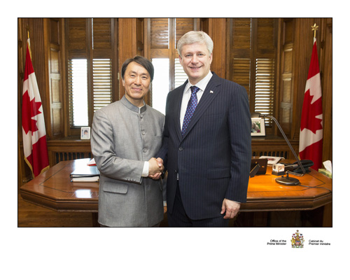 加拿大哈柏总理在加拿大国会山庄总理办公室欢迎国际著名艺术家何靖恒,哈柏总理更代表加拿大收藏何靖恒一笔而就之国画限量精制本“环宇一心”,为感谢何先生在世界各国和加拿大推广爱心、希望、生命中之美和艺术,哈柏总理更亲笔在欢迎何先生和“环宇一心”创作意境之合照上签名致意祝福,并亲笔致函感谢,鼓励并希望何先生、其艺术及“环宇一心”之爱心、希望和愿景为世界和加拿大作更大之贡献。