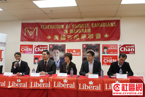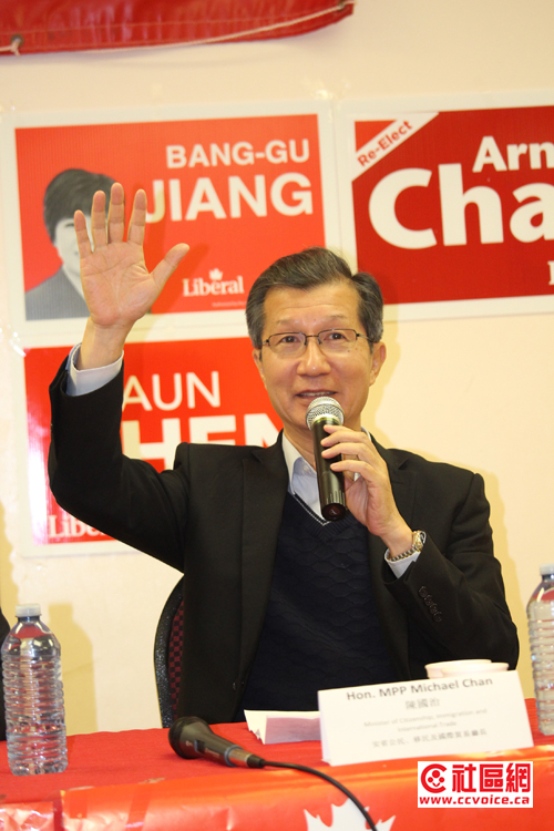 在2015联邦选举投票的最后日子,大多地区自由党国会议员华裔候选人举办特别媒体见面会,安省移民、公民与国际贸易厅Michael Chan也再次到场支持。