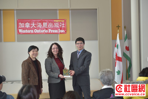 接下来,李彦院长向大家介绍了当天的特别嘉宾,也就是瑞纳森大学学院的校长Wendy Fletcher博士。从她的中文名字傅文笛,李彦院长介绍说,文笛校长不仅是著名的加拿大历史学家,而且也是一位杰出的艺术家,她所创作的油画在加拿大很有名气。文笛富有爱心,关心社区的文化发展,她让出版社免费使用她的画作之一做封面,绚丽夺目,十分漂亮。傅文笛校长表示,她非常高兴她的作品被用作封面,艺术是最有力量的,无论是写作,还是绘画,都能将生活中的许多哲理有效地表达出来,而在丰富和光大多元文化上,艺术也是最富有魅力,也最易于让人们接受的。对于傅文笛校长的爱心,主办方特意赠送新书一册,以示感谢。