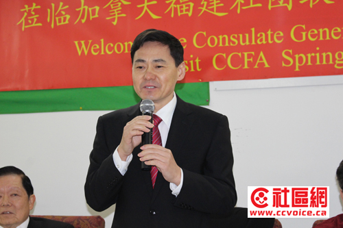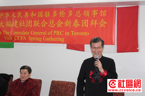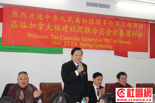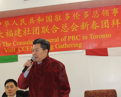 中国驻多伦多总领事薛冰携副总领事张传兵、领事钟洪糯和夏少杰于2月13日,正月初六到加拿大福建社团联合总会与福建乡亲团拜。联邦移民、公民及难民部部长麦家廉、参议员胡子修、国会议员谭耕、安省公民移民和贸易厅厅长陈国治、烈治文山市陈志辉市议员等也出席了团拜活动。