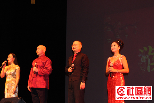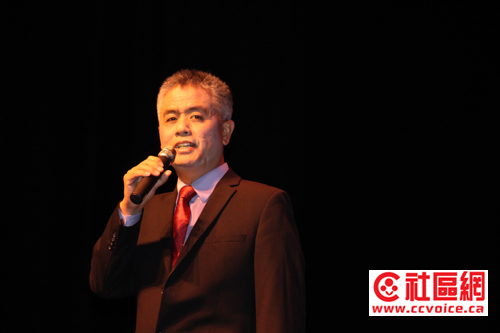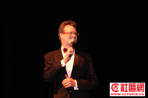 晚会在预定时间稍后正式开始,联谊会主席潘刚走上舞台,做简短讲话。潘刚主席说,有人说他以运营公司的形式在经营协会,他指出经营公司相对要简单得多,那就是自己说了算。而目前的滑铁卢地区华人联谊会已经有超过2,300的会员。会员就是股东,所以他觉得自己是如履薄冰,小心谨慎。对于该次春晚,他希望感谢春晚组织团队、60多位赞助商,以及庞大的义工团队。正是由于大家的热心奉献,这场精彩纷呈的春晚才有可能让大家如期欣赏。