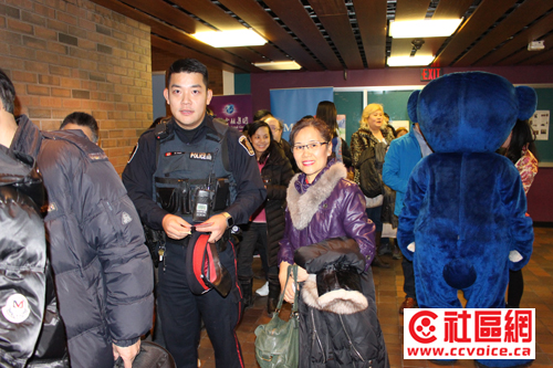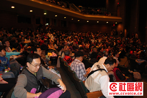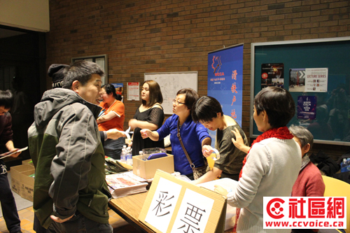 下午6:30,这是记者到达现场的时间!Humanities Theatre进门大厅已经人山人海。入口处是义工销售当晚幸运抽奖奖券的地方,该次活动得到RBC银行赞助Apple TV一台,将一抽奖方式送给观众。在活动宣传前,主办方也告知大家爱心捐献食物,现场的几个纸箱也装得满满的。而赞助商BMO银行的吉祥物当然也吸引小朋友,纷纷与之合影留念。