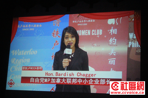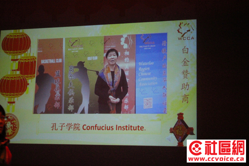 在潘刚主席宣布猴年春晚正式进行之后,大屏幕放映了本地政客与警察官员恭贺农历新年的祝福,包括有联邦中小企业部长国会议员Bardish Chagger、Kitchener中区国会议员Raj Saini、滑铁卢市长Dave Jaworsky、Kitchener市长Berry Vrbanovic、滑铁卢地区警长Bryvan Larkin等等。