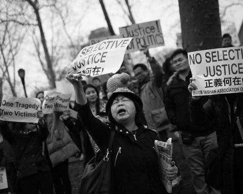 2月20日星期六,亚裔美国人短暂地打破了沉默:全美各地有成千上万的人们聚集到一起,抗议对彼得·梁(Peter Liang)的误杀定罪,这名前纽约市警官杀死了28岁的黑人阿凯·格利(Akai Gurley)。去年11月,就在圣路易斯一个大陪审团决定不起诉枪杀迈克尔·布朗(Michael Brown)的警官达伦·威尔逊(Darren Wilson)五天前,梁和搭档在布鲁克林区东纽约的路易粉红楼(Louis Pink Houses)巡逻。已经拔出枪的梁打开一扇通往楼梯井的门。枪击发了;一发子弹击中墙壁反弹,打中了格利。当时,梁和搭档没有对格利采取抢救措施,而是争论该由谁来给他们的上司打电话。