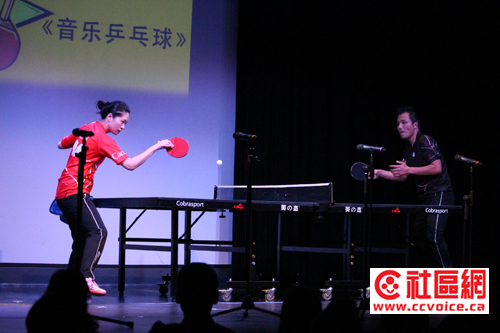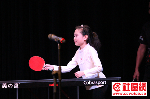接下来的节目很有新意,名字叫做Music Table Tennis。原来这是TYT阶梯启发潜能教育中心已经聘用加拿大乒乓球国家队教练在学校执教。正如匆匆从国家队训练场地赶来的老师所言,乒乓球能够锻炼小孩子各方面的才能,无论节奏感,还是平衡和协调能力。在教师示范之后,几位学生在现场与老师PK一番。