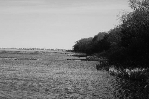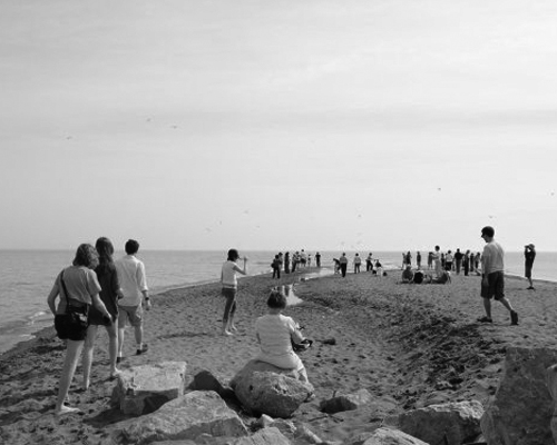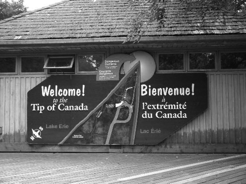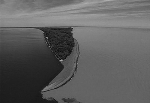 映入笔者眼前的一切都是原生态:泥土的芬香,浓密的树荫,杂生的灌木丛,悦耳的鸟鸣,让人心旷神怡清爽凉快。2公里半的路程10分钟就到了。木屋长亭,墙壁上用英、法语写着欢迎的标语。走过长亭,就是那倒三角形的细长部分。越往前行路面越窄,最后没有了树木,便露出大海般的Erie湖和湛蓝的湖水。再往前就是几米宽的尖嘴沙滩徐徐淹没于一泓碧水之中,在水天衔接之处便是美国俄亥俄州的克利夫兰。