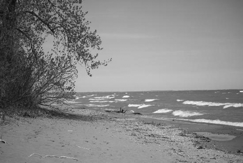 站在沙滩的尽头,伫立于习习夏风中,头顶蓝天白云,看浩渺的湖水,让人荡气回肠,仿佛置身于大海之滨。弯腰拾捡精美的卵石,拍照摄影留念。有感于大自然的造化。再过若干年脚下这“三角尖”恐怕也会沉没于湖底了。不远处那光秃的树干也不知道被海水侵没过多少次,没有人去打扰它,它却巧妙点缀了Erie湖的宽阔,给这里的美景增添了一份自然的力度。