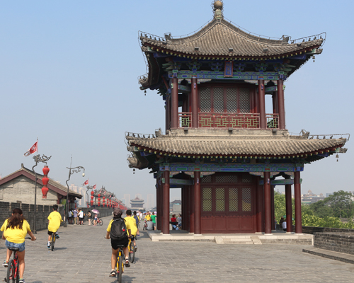 最初的西安城墙用黄土分层夯打而成,最底层用土、石灰和糯米汁混合夯打,异常坚硬。后来又将整个城墙内外壁及顶部砌上青砖。城墙顶部每隔40-60米有一道用青砖砌成的水槽,用于排水,对西安古城墙的长期保护起了非常重要的作用。那么,人们今天参观古城墙,可以干什么呢?第一,当然是看看城墙的雄伟,遥想当年战火纷飞的模样,该城墙所起的功效。第二,也许您想不到,那就是在古老的城墙上,骑自行车别有风味。即使是如此大热天,一部分营员们还是不放过这个机会,骑上自行车,绕着整个城墙转一圈,绝对是汗流浃背。据笔者观察,骑自行车的绝大部分是“老外”,看来,大家都想尝尝这种感觉的。