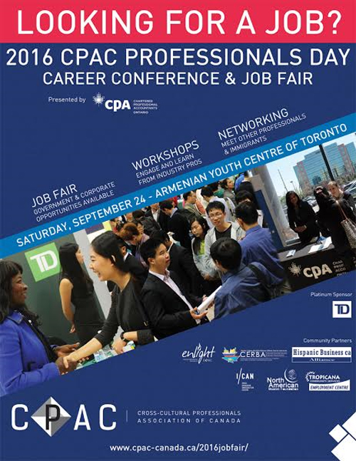 加拿大中国专业人士协会(CPAC)近日宣布,旨在帮助海外背景的专业人士(ITPs)在职业及专业上得以发展的专业盛会,第十五届CPAC“专业人士日”暨招聘会将于9月24日在Armenian Youth Centre举行。CPAC“专业人士日”历经十五年的沉淀,已成为整个大多地区在帮助移民专业人士职业以及就业发展方面最大规模的活动之一,每年都吸引了逾千名专业人士的参加。