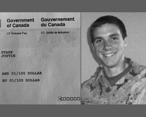 经过两年的调查,军方调查委员会认为Justin Stark在阿富汗7个月的驻勤并没有导致他患上战场压力后遗症PTSD、也不是他自杀的原因,所以不能按执行公务死亡处理、也不能得到阵亡军人的银十字纪念章。更加让母亲Denise难以接受的是,加拿大军方在她儿子身亡后给她寄来一张一分钱的支票,算是对她儿子作为军人的薪金结算。