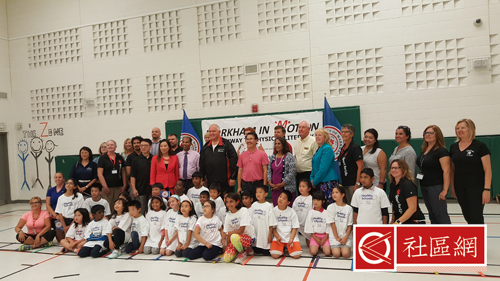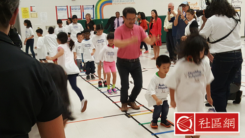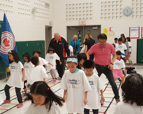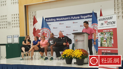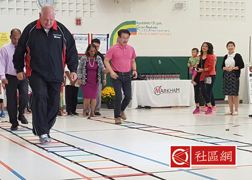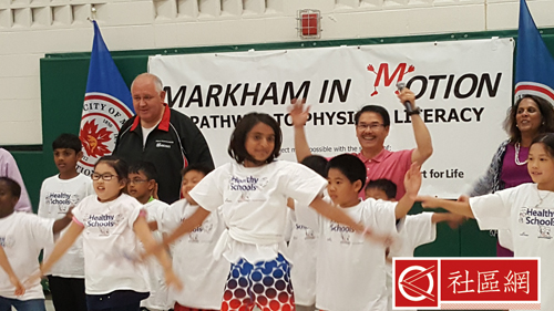 万锦市长Mayor Frank Scarpitti(薛家平)及万锦市社区服务委员会主席何胡景议员(Councillor Alan Ho)9月20日联同约克区公校教育局在John McCrae小学举办 了一项名为“动力万锦”(Markham in Motion)之发布会。是日出席除了万锦市府、教育局职员和体育老师外,还有不少学生和家长。