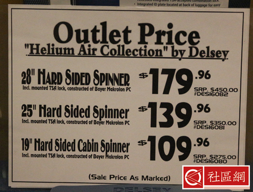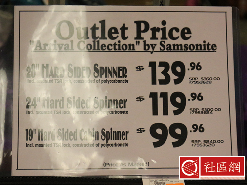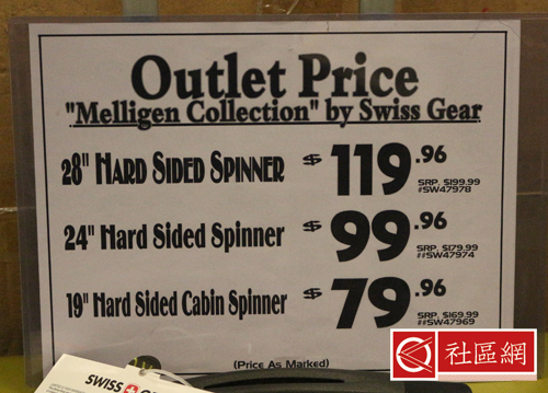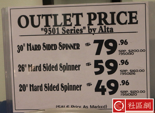 这不,小编提着照相机,紧赶慢赶,在商店关门前5分钟到达。还好,工作人员很耐心,知道小编的苦差事,推迟关门。这次考察的,小编只是强调下面几个方面。第一,价格优惠程度如何?估计大家从小编拍的价格标签就可以知道了,确实有差别。其实,还没有走进店里,小编就有感觉了。能够与Winers来拼价格和质量的,也就只有Luggage City,它们是邻居。第二,有些读者担心这是直销店,将来的维护和保修怎么办?据工作人员介绍,Luggage City有多家门市店,并且行李箱都是厂家提供保修的。顾客假若碰上质量问题,可直接与厂家联系,或者他们的门市店联系,就会协助解决,没有后顾之忧。