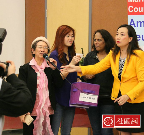 由陈厅长第一个抽幸运奖,得奖者高高兴兴,来个合影!活动在出席者齐喊“圣诞节快乐!新年快乐!(Merry Christmas! Happy New year!)”的欢呼声中圆满结束!与会者异口同声地说,“我们度过了一个快乐的下午,谢谢杨议员给大家这个欢乐的机会!”(文/万锦市第六区长者协会林梅英/文,图/吴观发)