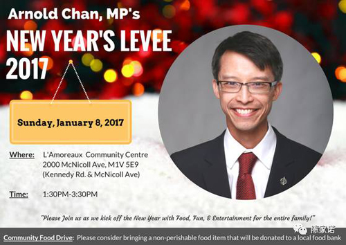 士嘉堡爱静阁联邦国会议员陈家诺第三届社区新年联欢会将于1月8日下午1点30至3点30,在位于Kennedy Road和McNicoll Avenue 西北角的L’Amoreaux Community Centre举行,欢迎选区民众到时参加!更多详情请参阅海报。