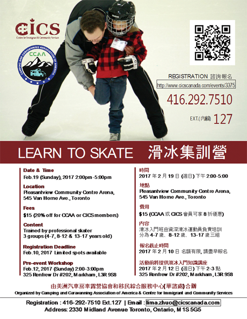 美洲汽车房车露营协会(CCAA)与移民综合服务中心(华咨处,CICS)秉承共同宗旨–帮助中国新移民尽快融入加拿大多元文化社会。鸡年新春伊始,双方及宣布将联合组织新移民子女学习和参与冰上运动。通过资深冰上运动员手把手带领华人青少年学习滑冰,使更多的新移民家庭能接触和热爱加拿大最流行的运动,增强与主流社会融合交流的信心。