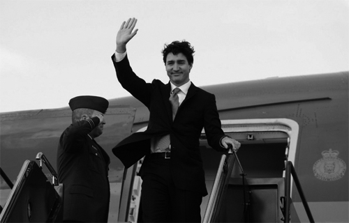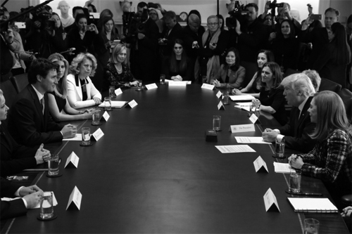 2月13日早上,总理Justin Trudeau乘专机离开渥太华,前往华盛顿。据报。由于大风,飞机没有在Andrews军用机场降落,而改在Dulles机场。在进入白宫之前,美国总统Donald Trump在白宫西翼大门迎接Justin Trudeau,两人面带微笑,欢快地热情握手。