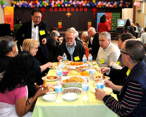 这次饺子迎新春佳节活动,我们还请了十多位路德教堂的外国朋友们,担心煮饺子他们吃不惯,会长还特意为他们准备了外国人喜欢的中国炒面和春卷,并将最中心的位置留给了他们。充分体现了中国人的待客之道。陆焕松先生正在向老外们介绍春节吃饺子的由来!
