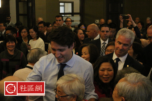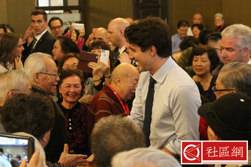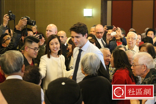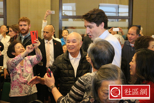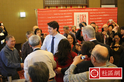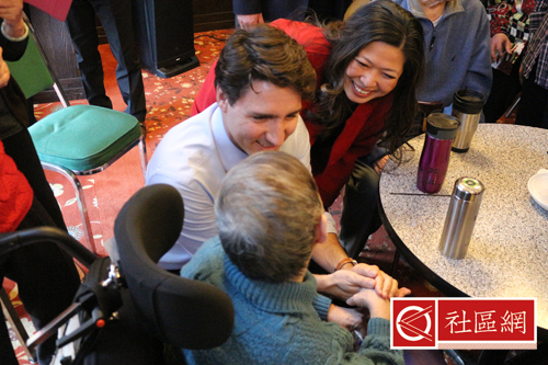 总理Justin Trudeau首次到访的是大家熟知的养老院–孟尝会,相对比较新的建筑,位于Steeles与Midland交界处。令记者感到惊讶的是,在颜值高的总理Justin Trudeau面前,耆老们也疯狂。本来他们都安排有座位的,总理一到场,大家就围观上去了,也就是大家基本跟着总理走,没有一丝疲劳相!不过,总理Justin Trudeau还是考虑很周到的,整个大厅都基本转了一圈,抱抱现场的婴儿,蹲下与坐轮椅耆老短谈,估计都让媒体抓拍到了。而补选候选人Mary Ng当然是身随左右,只是由于身高问题,估计媒体没有抓拍到非常般配的照片了!