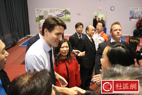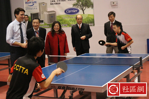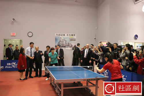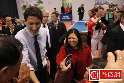 下午4点,总理Justin Trudeau基本准时出现在现场。活动现场差不多十分钟后,记者就急忙离开,赶往下一个场地–加华乒乓球协会。幸好,尽管是上下班时间,Steeles上交通异常地好,记者在4:30顺利赶到。媒体汇聚之后,再次经过警犬安检之后,一行就前往乒乓球练习现场。记者估计主办方安排了国家队员,在此表演。估计是下一场时间的安排,总理Justin Trudeau很快就来到现场,观看队员们表演之后,一一握手。
