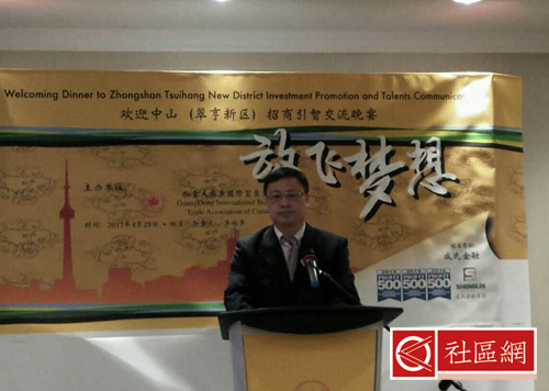 为加强中山市与加拿大的商贸、科技、人才、产业交流合作,吸引高层次人才和高科技项目落户中山市翠亨新区,加拿大广东国际贸易商会4月29日晚上举办欢迎中山(翠亨新区)招商引智交流晚宴。联邦国会议员陈家诺和Bob Saroya,联邦国会议员潭耕助理黄志勇,中国驻多伦多总领馆科技参赞沈建磊,万锦市长Frank Scarpitti,多伦多副市长黄闵男,万锦区域议员安思创和李国贤,多伦多市议员李振光,万锦市议员Alan Ho,列治文山市议员陈志辉等政要出席。