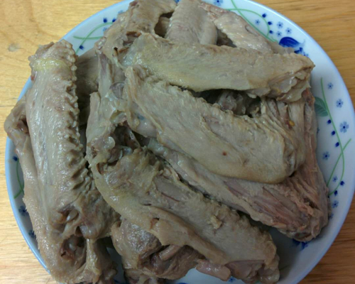 至于提出“肉嫩而不糜烂”的要求,笔者认为吃鸭翅膀的兴趣并不是能够啃下来多少肉,而是享受啃的过程。假若蒸煮时间过长,稍稍用力,鸭翅膀上的皮与肉都能自己脱落的话,似乎就失去了吃鸭翅膀的乐趣。不过,话又说回来,经常吃鸭翅膀的人,估计有一腔好牙齿的!