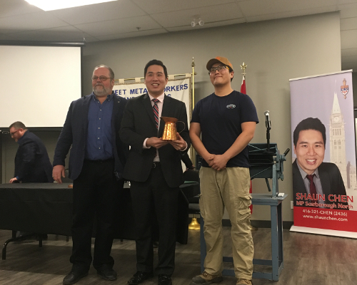 3月9日联邦国会议员陈圣源(Shaun Chen)在安省士嘉堡代表加拿大就业、劳动力发展与劳工部部长Hon. Patty Hajdu宣布一项新计划,计划关于在技工培训用品与材料方面资助学徒以获得其所需技能。此项计划将被包括在工会培训与创新计划(UTIP)中。联邦政府将提供超过$110,655的资金予钣金技工与屋顶修建技工工会(Sheet Metal Workers’ and Roofers’ Union),用于建设城建信息模板教室。工会将用此项资金购买设备,让参加者学习此类技能,帮助参加者获得钣金与屋顶修建行业的工作。