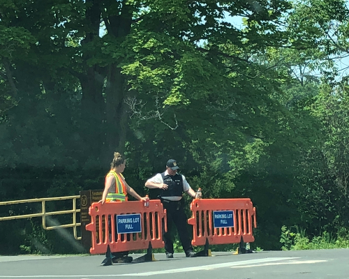 在快要接近公园的时候,汽车越来越多,渐渐地,基本上是蠕动前行。更为要命的是,路边开始有零零落落的泊车,再加上三三两两的行人,让原本就窄的道路行进十分困难。不过,我们自然也没有其他办法,只能跟着前面的车蠕动。10多分钟之后,我们总算到了交叉路口,往右拐就是进入公园,没有想到公园工作人员将道路堵住,只有让露营的人驾车入内,其余的车辆都不能进入。