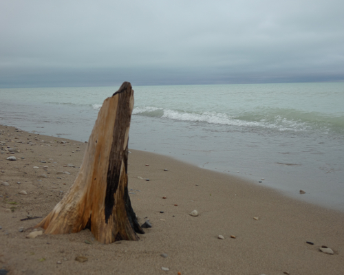 在沙滩上,笔者看到多处树桩,原以为这是波浪冲洗过来的,但试图用脚推倒,竟然没有办法,原来这是长在湖岸的,但其中一个树桩还留有火烧的痕迹。这让笔者浮想联翩,难道这里曾经发生过大火,进而留下Ashfield这样一个名字。不过涡轮如何,当年的森林覆盖可能延申到今天已被湖水覆盖的地方,这是人类的“罪证”吗?