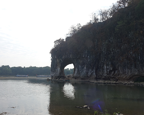 据介绍,象鼻山原名漓山,又名又叫仪上或沉水山,位于桂林市内桃花江与漓江汇流处。山因酷似一只站在江边伸鼻豪饮漓江甘泉的巨象而得名,被人们称为桂林山水的象征。象鼻山以神奇著称。其神奇,首先是形神毕似,其次是在鼻腿之间造就一轮临水明月,构成“象山水月”奇景。因此,象鼻山是桂林的城徽山,是桂林旅游的标志山,它坐落在桂林市中心的漓江与桃花江汇流处,形似一头巨象,象鼻和象腿之间是面积约一百五十平米的圆洞,江水穿洞而过,如明月浮水。坐落西岸的象山水月与漓江东岸的穿月岩相对,一挂于天,一浮于水,形成“漓江双月”的奇特景观。关于象鼻的形成,要参考地壳运动。距今约1.2万年前,地壳抬升,丽江缩少,加速水月洞橡上水月的发育,形成一个通透的圆洞。该洞长17米,宽9.45米,高12米。其中《象山记》一书是如此描述的,“有石穴一,彼此可以相望形圆而长,其半入漓水中,水时高时下,故其穴亦时有大小。”