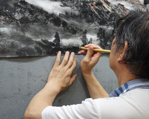 当然,由于早就期盼对江山艺术馆的参访,笔者自然也不会错过这个机会的。在胡江的亲自带领下,笔者对江山艺术馆有一个简单的了解。这是一栋四层楼的民居,江山艺术馆(精品展厅)安排在第三楼,而二楼是胡江的创作空间。无论是预留的宽阔而高耸的墙壁,还是超级大的画桌,都让笔者震撼。据胡江介绍说,打通两层的墙壁能够方便创作巨幅作品,而超级画桌当年是通过吊车将其搬进来的。