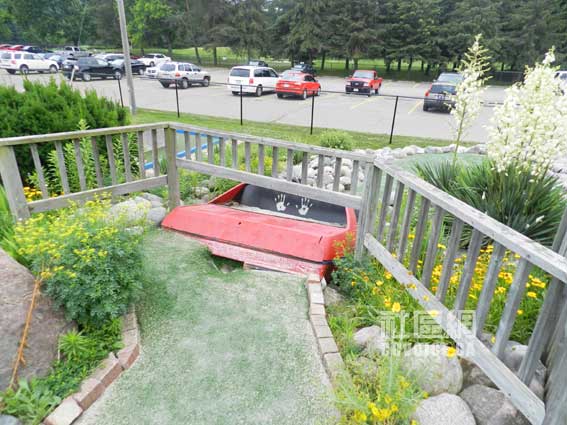 靠近练习场的发球区,就是Harry’s Goofy Golf,即迷你高尔夫球区,这是笔者看到的最漂亮的高尔夫球去,远远好过几年前我们在游轮上所玩的。据介绍,这个迷你高尔夫球场是一个传统的高球场,鉴于1860年,能够满足当年迷你高尔夫职业球赛的规格,在过去50多年受到人们喜爱。