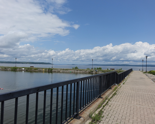 颇为意外的是,旁边的游泳池竟然是开放,多个小女孩在玩水。尽管靠近湖边,但游泳池是人工建成的,估计与湖水相连,但游泳池内的沙滩并非自然的。在游泳池中央还有一个高高的喷泉。而堤坝之外,望不到边际的水面自然昭示这个湖并不小。