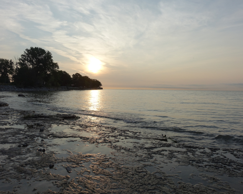 到了湖边才发现,湖底竟然全是石头,这还真是出乎笔者意料之外。但这也让笔者了解到Lake Erie的形成,估计与地壳运动相关,那可是时间的最好记忆。好在这个位置看日出还不错,究竟有湖水为背景。笔者也试图沿着湖岸回走一段,但似乎此路不通,倒是看到密林中有人搭建了一个简陋的棚子。尽管没有标记私人境地,但笔者也只是远远拍照一张,没有踏入。