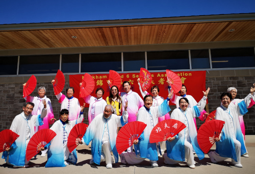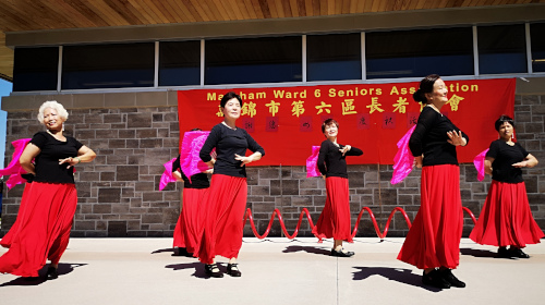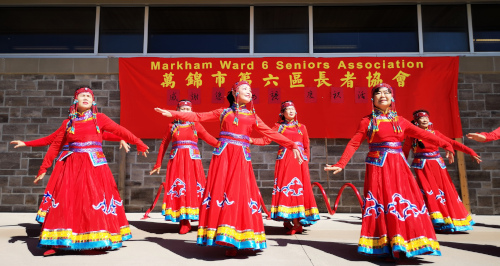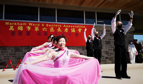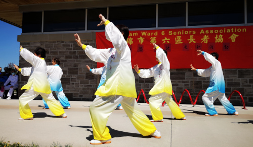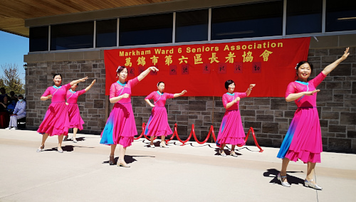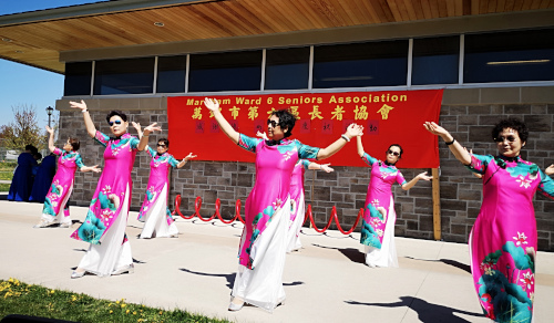 丰富多彩的演出开始了。看!欢乐人生的模特队表演“飒爽英姿俏夕阳”、舞蹈“看月亮花开的地方”;童心协会太极“ 二十八式太极”、交谊舞“为祖国干杯”;万锦市晚晴活动中心歌唱“新货郎”;万锦星光祥和协会的蒙古舞“游牧时光”、歌伴舞“天边的骆驼”;友乐天地长者协会的“旗袍儿女情”、表演唱“回娘家”以及我会的扇舞“珊瑚颂”、太极“混元太极扇”、旗袍“秋水伊人”,每个节目都很精彩,得到了热烈的掌声,甚至还有与会者跟着齐唱“小货郎”。杨议员独唱“月亮代表我的心”,最后还和长者们一起高声合唱粤语歌曲:“友谊之光”,唱出了我们的心声,“……今天且有暂别,他朝也定能聚首;纵使不能会面,始终也是朋友;说有万里山,隔着两地遥,不需见面,心中也知晓,友谊是改不了!”