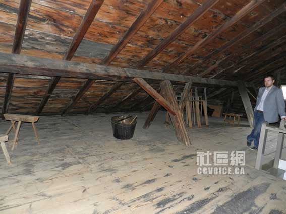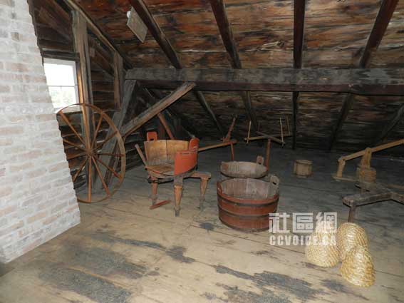 再往上,就是我们通常所说的阁楼,这是我最喜欢的部分!为何比较喜欢呢?我的感受有几点。第一,楼板结实,你可以任意跑跳,那是绝对没有危险的,而且噪音相当小。第二,空间比较开阔,看阁楼摆设,当年这里应该也是小孩的游乐场。目前主要摆放的尽是一些农具和其他工具。Kyle特意说,“通常有小孩来参观,他们往往不敢放开步伐,我一般会告诉他们,放开胆子走,这里是绝对安全的!”你可以想象当年,在一个宁静的下午,小孩可以偷偷拿上一本小人书,在阁楼上一个人躲着看,那应该是不错的感受的!