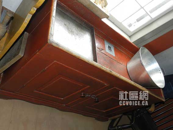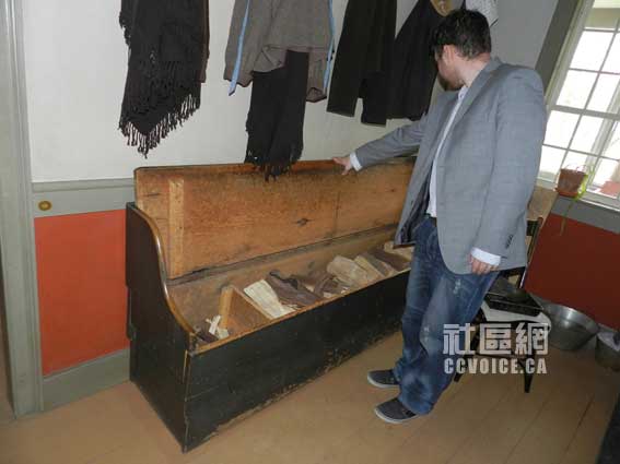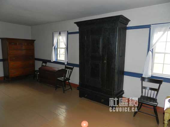 参观约瑟夫-施纳德老屋,我们并非从原始的大门进入,相反是从过去Joseph Schneider家人自己进出房间的侧门入内。所以,踏入约瑟夫-施纳德老屋,我们就直接来到当时最重要的房间,相当于今天的餐厅与客厅。人们可以在此吃饭、工作,也是厨房所在地,同时也是火炉所在地。笔者想见,在寒冷的冬天,他们全家可能在此烤火、取暖的。在这房间,两件家具引起笔者的注意,第一就是水池,可以看出今天厨房水池的影子;第二是存放烧火木材的柜子,盖上之后就是一个长的板凳,记得笔者原来老家就有类似的东西,只是这里的相对很大。注意,正门进来也是这个房间,看来,有点类似中国农村的堂屋/大厅!