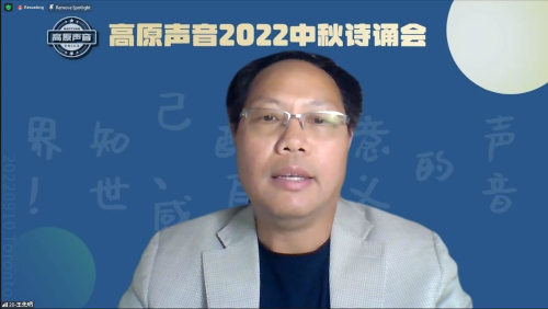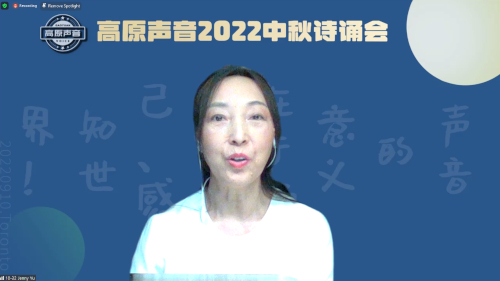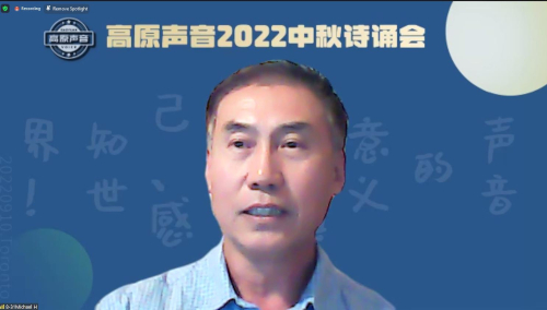 本次诗诵会总统筹Michael He在致辞中欢迎各位来宾欢聚云端,共度中秋佳节。他介绍说:参加中秋诗诵会朗诵的不仅有高原声音语言艺术中心的学员,还有不久前从这些学员中经过专业考核选拔出来的高原声音朗诵艺术院的朗诵员们。他们在播音朗诵艺术家、有声语言艺术教育家、科学发声与声音塑造权威专家、播音主持专业教授高原老师的精心教学和辅导下,经过系统的学习与训练,语言能力不断提高,创作水平逐步加强,可以驾驭不同体裁、不同风格、不同语言类型的有声语言作品。他衷心地感谢高原老师多年以来所做出的辛勤付出,感谢为高原声音做出奉献的朋友们,并特别感谢媒体的关注与支持。