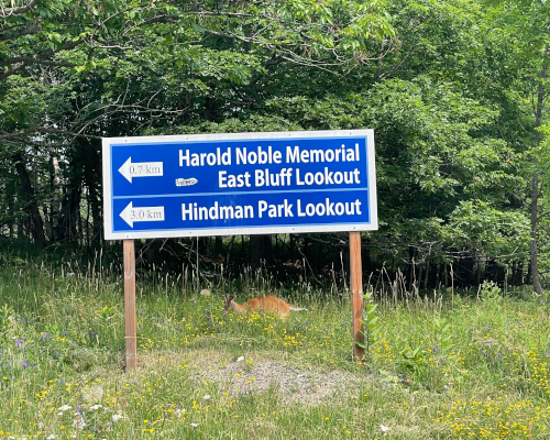 从Kagawong小镇开车到Gore Bay,距离并不远!在GPS的指点下,七拐八弯之后,我们就靠近了所谓的East Bluff。正要进入East Bluff路时,旁边树林中跳出一只小鹿,特意在指示牌停留,似乎是让我们拍照留念。