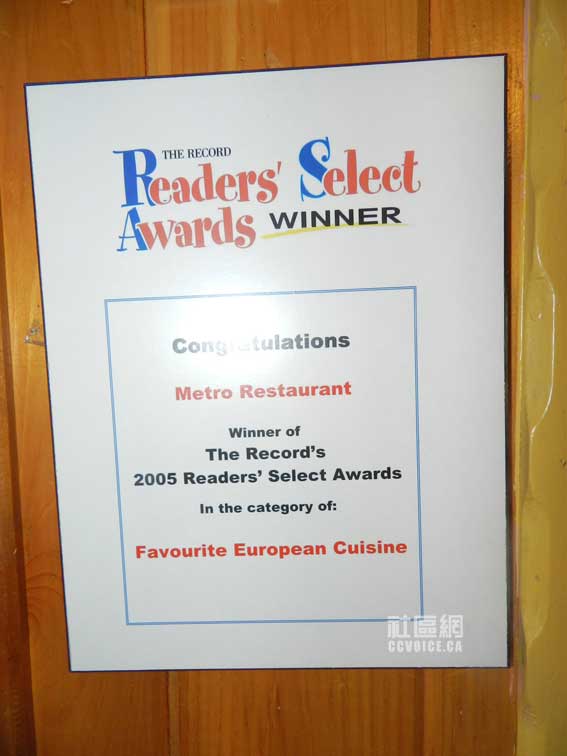 搬到滑铁卢地区之后,笔者也尝试找到那种环境优雅、味道可人的欧式餐厅,但一直未果。功夫不负有心人!在滑铁卢地区华人联谊会2013年春节联欢晚会上,笔者有幸得到一个赞助商的信息—Metro欧式餐厅(Metro Restaurant),简单的传单上显示这家餐厅于1961开始营业。收到此传单之后,笔者一直保存着,计划有一天前往了解,觉得它也许是笔者的梦中所在地。