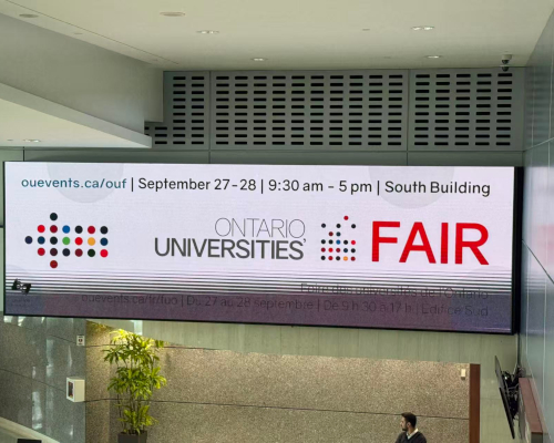 进入展馆,笔者的第一印象是:这似乎是本人第一次体验仅限安省大学的展会,规模不算宏大,但人流却超出了预期。各校展位整齐排列,学生们穿梭其间,气氛热烈而有序。我先到展览办公室领取了一份媒体证,方便在现场拍照记录,也为这次陪伴增添了几分“工作”的意味。