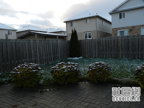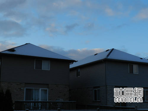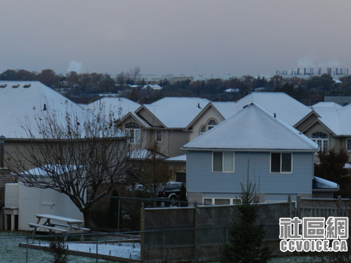 早上爬起床,掀开窗帘,一看,我的天!外面有些白茫茫,下雪啦!以为自己眼花,戴上眼镜,再仔细看看!可不,确实下雪了。房檐、屋顶、街道、树木都有雪点缀。天空是那么近,厚厚的云层压着,好像还要横扫山河似的。这可是初冬的一场雪,我还没有一丝心理准备。现在才想起来,昨晚7点在滑铁卢图书馆的时候,一个人告诉我,下雪啦!我当时是万分的不相信!后来自己走出来,也没有见到雪,所以也没当回事。一觉醒来,世界就变了!赶紧拿起相机,将这初冬的雪纪录在自己的档案里!