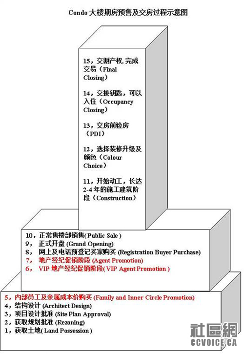 *注释:“战略买家,在Condo期房市场上,有这么一部分非常有经验的投资者,他们长期跟踪观察市场,和一些大的有信誉的开发商长期合作。只要这些大的开发商在好得地段有好的项目,就会在第一时间出手。比如在图表五《大楼期房预售及交房过程示意图》中的第五阶段或第六阶段期间,用最低的成本价格选购朝向及结构最好的房子。或者是在市场冷淡期, 有些大的开发商会给这些战略买家一些内部信息, 将内部清仓处理余下的一些准现房, 并给予很大的折扣。有时百分之五到百分之二十不等。无论是哪种形式, 最终要达到的目的就是最大程度地控制投资成本: 房屋的买入价。也就是要实现笔者所提出的Condo 投资四个基本原则的最后一个原则:相对低的买入价原则。只有这样才能实现: 在市场好的时候, 赚的钱比其他人多一些。在市场不好的时候,风险比其他人低很多。要成为战略买家,需要时间建立人脉关系及积累经验信用,更需要合作精神。有的时候,团购也是成为战略买家的一种有效形式。
