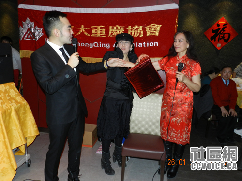 美食之后,就是娱乐时间,主持人就有回流湖南卫视的秦屹小伙子。方式很传统,通过击鼓传花的形式,到了那桌,由那桌派代表来表演节目。在现场,大家也可以感受到,重庆妹子不仅漂亮,也非常大方能干,说话唱歌均很在行。值得特别一提的是,夏领事今天表现特别,不仅与自己的儿子合唱在中国大陆流行的《爸爸去哪儿》,而且与川妹子二重唱《夫妻双双把家还》。