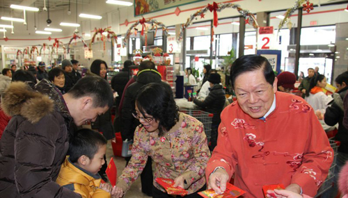 密西沙加元明超市在中国农历新年大年初一为顾客派发红包。即将93岁的密市老市长麦考莲,国会议员胡子修,中国驻多伦多副总领事吴冬梅,省议员 Bob Delaney,市议员Ron Starr等嘉宾在超市内分别通过店内广播系统向大家拜年并派红包。元明超市老板欧阳元森介绍说,今年是他们连续第四年举办同类庆祝活动。(来源:星星生活)