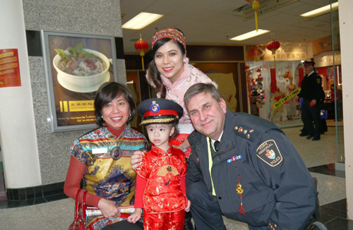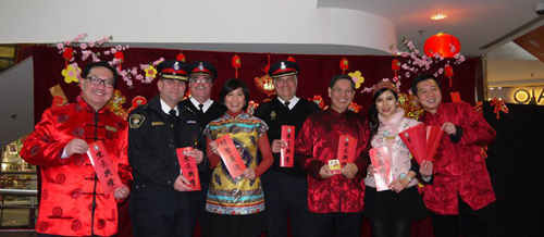 农历新年向商户拜年是烈万市华商会的传统。今年会长何邓小仙与卸任会长温建业、副会长梁万邦、会董韦邱佩芳、朱万舒、金剑平及Catherine Miao,与约克区警察总长祖列夫、第五分局(万锦市) 警司Graeme Turl、第二分局(烈治文山市) 警司Graham Beverly和多位警务人员,以及万市议员何胡景及约克区域议员李国贤,烈市议员廖立晖、陈志辉,到太古广场和时代广场向商户拜年,祝愿百业兴旺、马年顺景、生意蓬勃。(来源:星星生活)