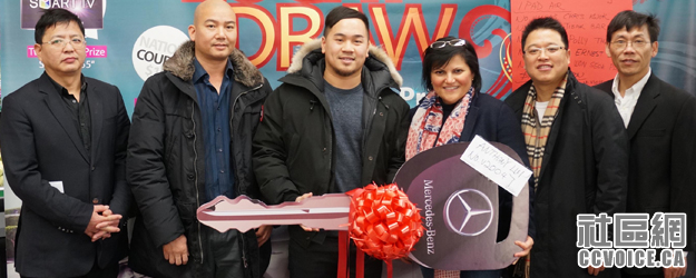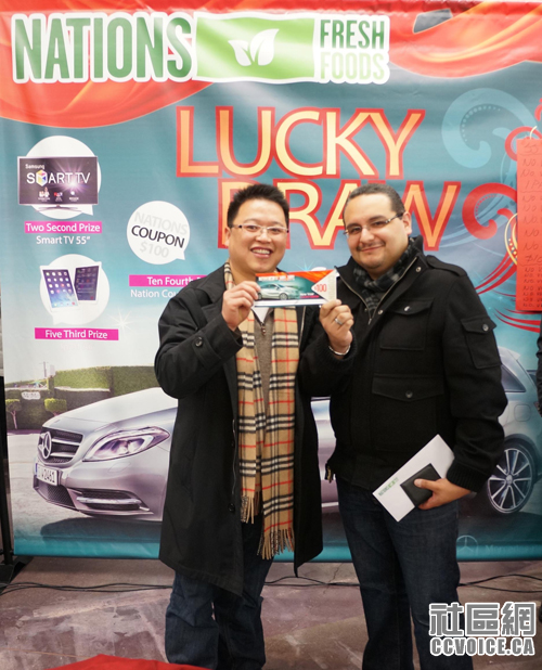 2月3日,一个在2014年难得的好天气!位于在Hwy 7和Weston交界的Nations Fresh Foods超市Vaughan分店热闹非凡,历时50天的有奖抽奖活动今天揭晓。本次活动从2013年12月13日开始,凡在该分店购买超过$50商品的顾客就有机会获得奖券一张,最高奖项为一辆奔驰B250(Mercedes Benz B250)。