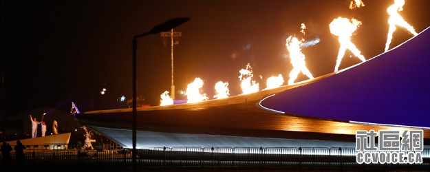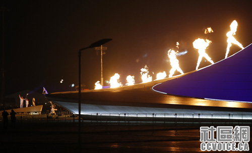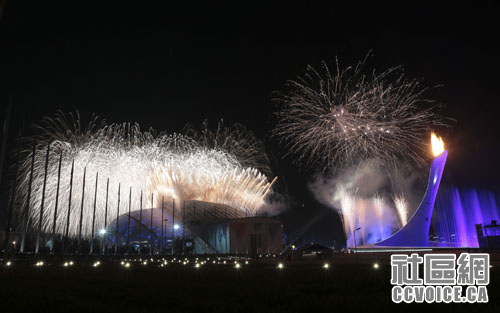 开幕式在索契奥林匹克公园举行,火炬与烟花在夜空中交相辉映