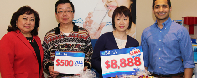 加拿大高乐氏顾客市场与多元文化市场团队主管Kaery Lall前来为获奖者颁奖。他说:“Brita Canada一直十分尊重与重视多元族裔的文化,我们明白春节在华人社区的重要。我想藉此机会告诉大家,从生活中点点滴滴的小事做起,就能使自己的身体更健康,周围的环境变得更好。Brita Canada为顾客带来最高质量的饮用水的同时也在为维护我们健康且可持续发展的环境而努力。”