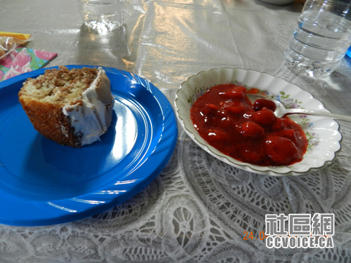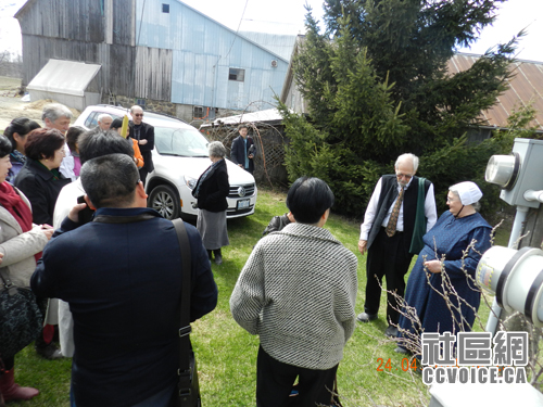 更让我们激动的是,Simon夫妇非常热情,为大家准备丰盛的晚餐。30多人围坐在一起,非常温馨,也非常气派。主食包括有水煮土豆、水煮甜玉米粒、凉拌卷心菜、炖牛肉和圆面包。甜点由自制蛋糕、自腌草莓酱,再加上自产枫糖浆和牛角小面包。最后还为大家提供富有传统的茶,稍带中药味。大家在赞叹美味可口、自然健康的同时,对曼侬派生活与文化有一个全新的认识。